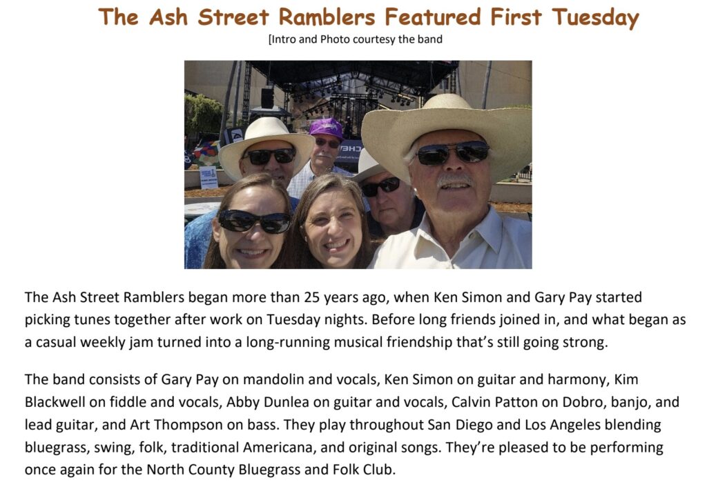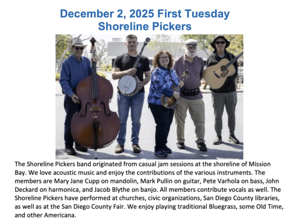 Music Nights are free, and open to members and the general public. We offer live bluegrass and folk music beginning at 7:00 pm on the first Tuesday of every month. Our opening spot gives upcoming bands the opportunity to perform for an appreciative audience. And, at 8:00 we feature one of our many talented San Diego and SoCal bands. Come join us for a great evening of music. Questions – contact us at info@northcountybluegrass.org