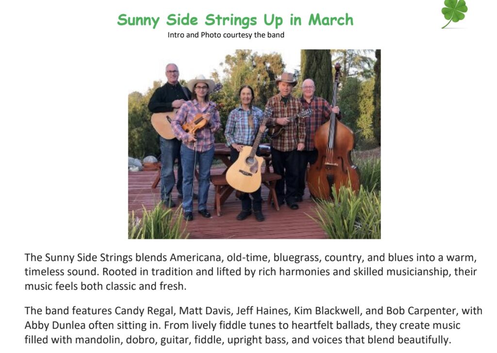Sunny Side Strings excels in Americana, old time, bluegrass, country and blues. The band consists of Candy Regal on rhythm guitar, Matt Davis on lead guitar, Jeff Haines on mandolin, Bob Carpenter on Bass and Kim Blackwell on fiddle. You won’t want to miss the sound of their interwoven stringed instruments or the harmonies that give their music its distinct touch. Check them out on FaceBook.